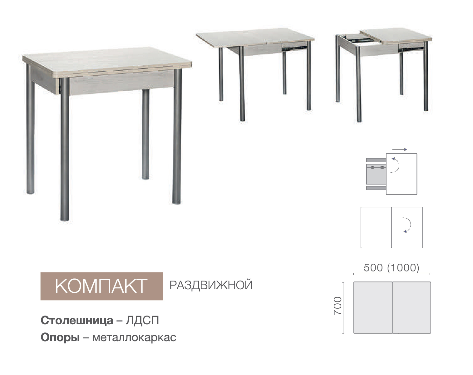 Стол раскладной "Компакт" изготовлен из ЛДСП, акантовка стола из противоударного ПВХ в 2 мм. Стол имеет механизм трансформации. Название этого стола говорит само за себя - компактный и современный, он создан для людей, ценящих своё жизненное пространство и функциональность: с помощью оригинального механизма трансформации его длина увеличивается в 2 раза. Этот стол находка для маленькой кухни! В сложенном состоянии он займет совсем немного места, однако, в случае необходимости, при помощи всего пары простых манипуляций, Вам удастся превратить его в большой стол и достойно принять гостей. Каркас (ножки) стола выполнен из металла, покрытого полимерным покрытием (технология порошковой окраски). Покрытие устойчиво к коррозии и механическим повреждениям. Ножки стола крепятся к раме при помощи специальных болтов, чтобы при необходимости стол можно было легко разобрать и транспортировать. При этом стол может быть укомплектован как прямыми, так и изогнутыми ножками, придающими столу помимо оригинальности дополнительную устойчивость. Наш ассортимент позволит Вам подобрать к столу подходящие по стилистике стулья или табуретки. Материал столешницы ЛДСП гигиеничный, легко моющийся и термостойкий, к тому же не боится пятен от кофе, вина, пищевых продуктов. Торцы покрыты пластиковой кромкой (ПВХ), что по мимо эстетики повышает травмобезопасность. Поставляется в разобранном виде.