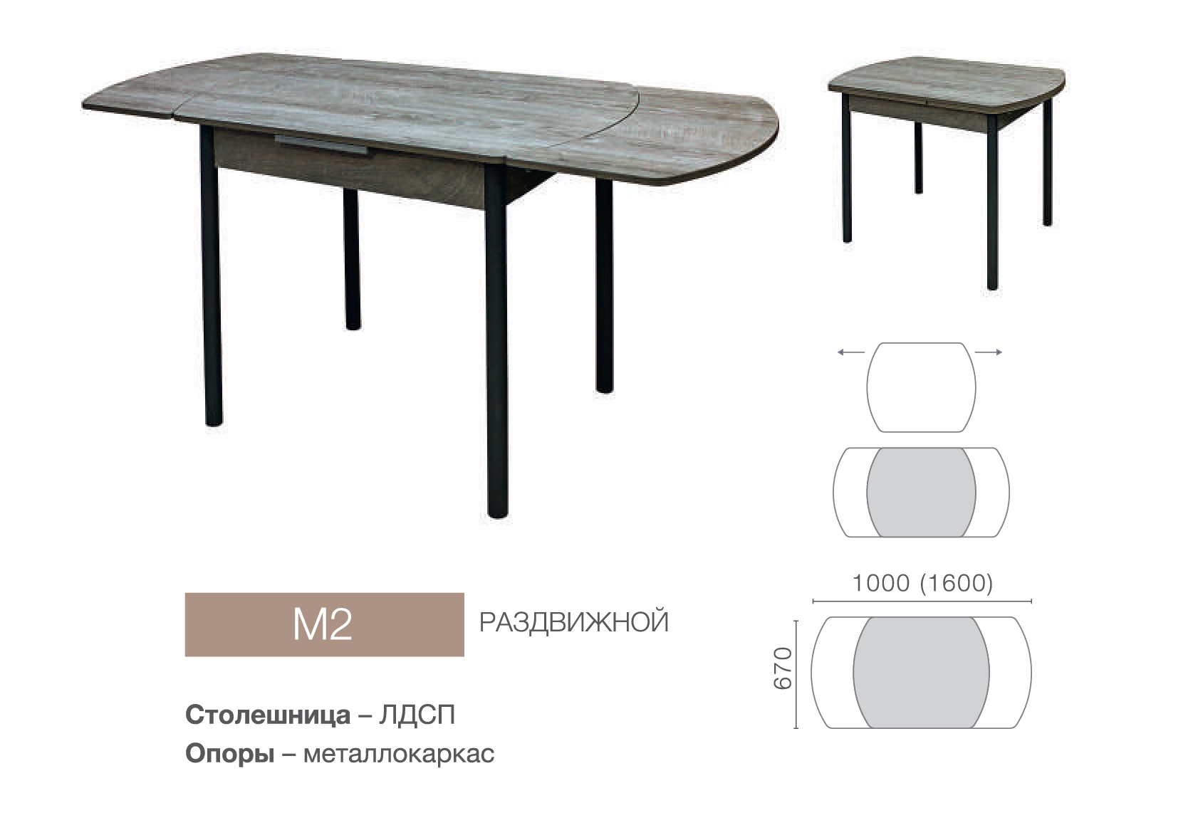 Представляем Вашему вниманию стол раздвижной М2. Стол изготовлен из современного материала: ЛДСП. Раскладной стол великолепно подходит для использования в небольших помещениях. В сложенном виде его можно использовать как письменный стол или обеденный на 1-3 человека. В разложенном виде стол имеет вполне внушительную рабочую поверхность, которую можно использовать как для работы, так и для размещения большого количества гостей. Металлический каркас стола придает столу надёжность и долговечность конструкции, а качественные материалы столешницы создают презентабельный внешний вид. Стол доступен в различных цветовых исполнениях.